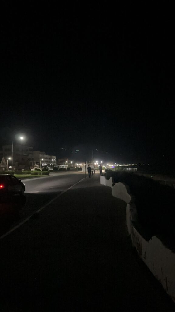 昼間は気付かなかったけど、街灯がいっぱい立ってて安全そう。こんな時間なのに歩いてる人もボチボチいて、治安の良さが伺えるな。