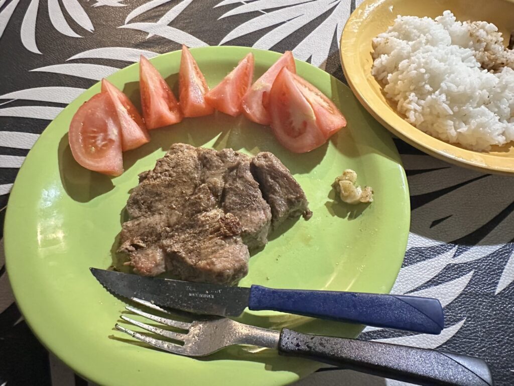 晩飯は買ってきたお肉とトマト。