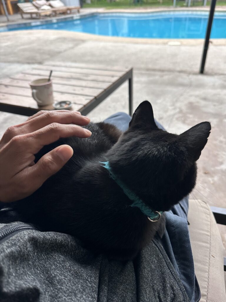 朝、プールサイドでのんびりコーヒー飲んでたらネコちゃんが近くにいたから呼んでみたら膝の上へ。