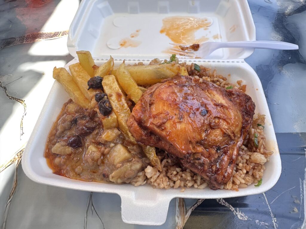 鶏肉は甘めの味付け。柔らかくてメッチャうまい!チャーハンもあるしちょっと中華風なのかな?近くには中華料理屋もいっぱいあったし。
