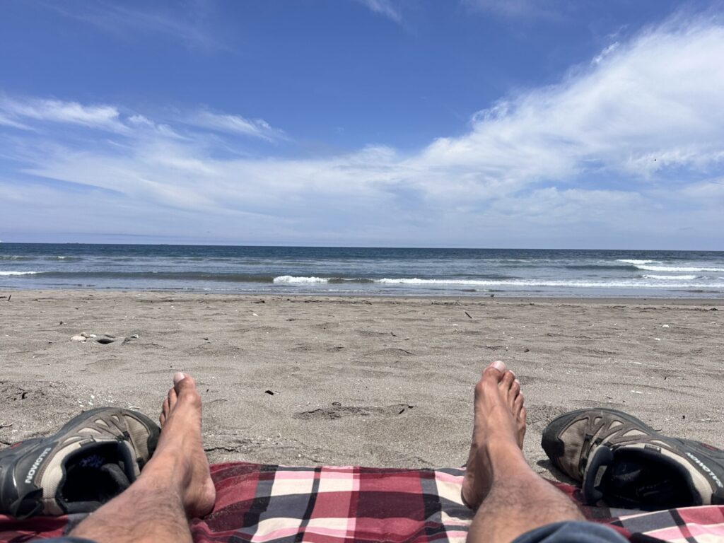 気温は20℃ちょっとだから水着は持ってこなかったけど、敷物は持ってきたからビーチに広げて、Tシャツ脱いでのんびり。