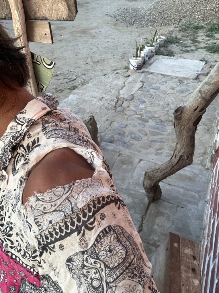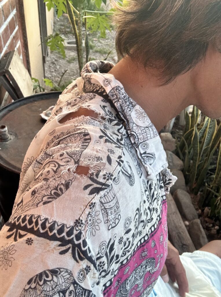 肩のところばっかり破けちゃって、多分リュック背負ってよく歩いたから擦れちゃったんだろな。
