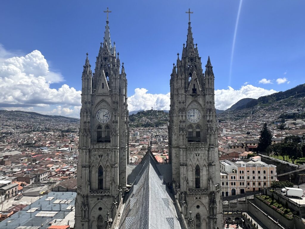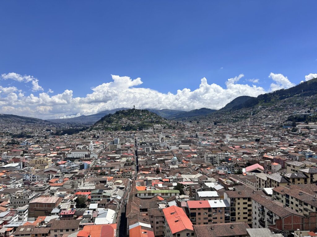 写真じゃちっちゃくて見にくくなっちゃったけど、2本の時計台のちょうど間に、丘の上に立つ『Virgin of the Panecillo』の石像が見えるのね!