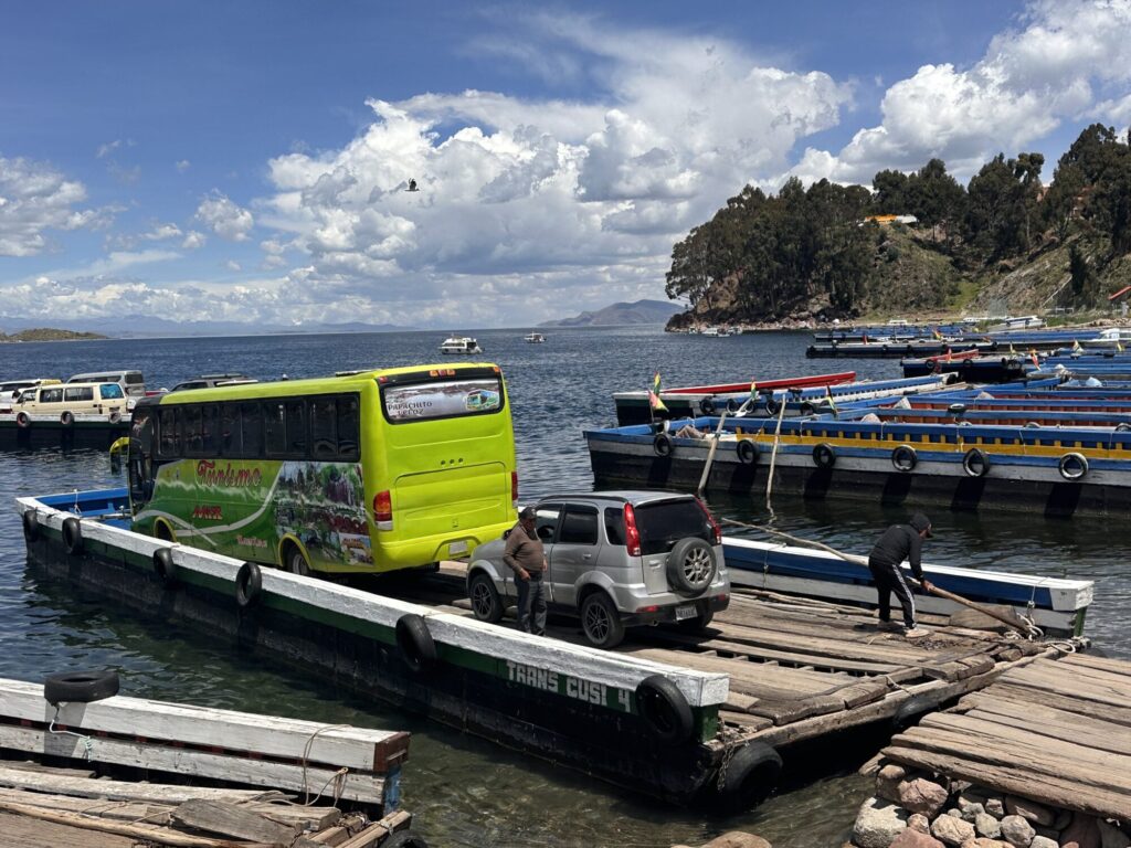 13:45、『Tiquina(ティキナ)』ってとこに到着。ここからバスごと船に乗っけてチチカカ湖を渡るんだけど、