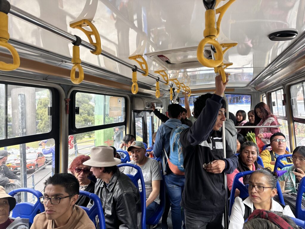 フロントガラスに行き先がいくつか書いてあるからよく見たら『MItad del Mundo(世界の中心)』って書いてあったから、車掌に確認して乗車。